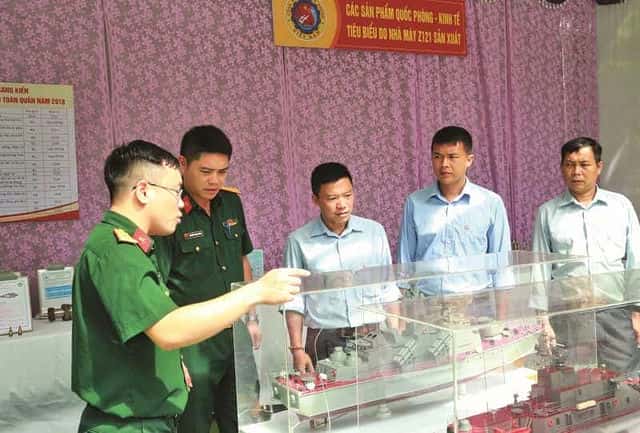 Các điển hình tiên tiến thăm quan mô hình sản phẩm tàu quân sự do ngành CNQP đóng mới, được trưng bày tại Hội nghị sơ kết 5 năm thực hiện Cuộc vận động.  Ảnh: BẢO LÂM