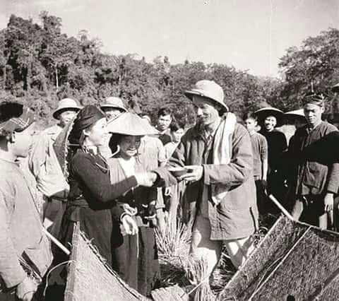 Chủ tịch Hồ Chí Minh đến thăm nông dân tỉnh Bắc Kạn đang thu hoạch lúa (năm 1950). Ảnh: TL
