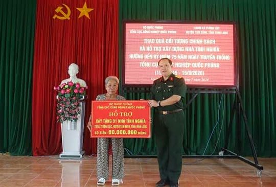 Đại tá Nguyễn Việt Hùng, Phó Chính ủy Tổng cục CNQP, trao 80 triệu đồng hỗ trợ bà Lê Thị Dung là vợ liệt sỹ hi sinh trong kháng chiến chống Mỹ.