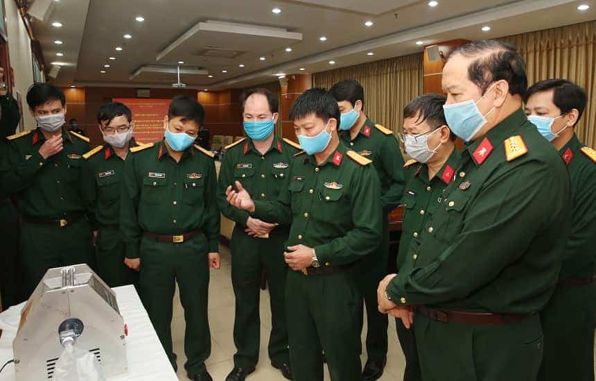 Đại tá Nguyễn Việt Hùng, Phó Chính ủy Tổng cục CNQP (ngoài cùng bên phải) kiểm tra sản phẩm máy trợ thở di động do Viện Vũ khí nghiên cứu thiết kế, chế tạo.