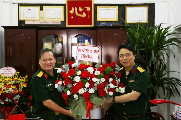 Đại diện lãnh đạo, chỉ huy Nhà máy Z131 tặng hoa chúc mừng Ban biên tập Tạp chí.