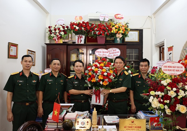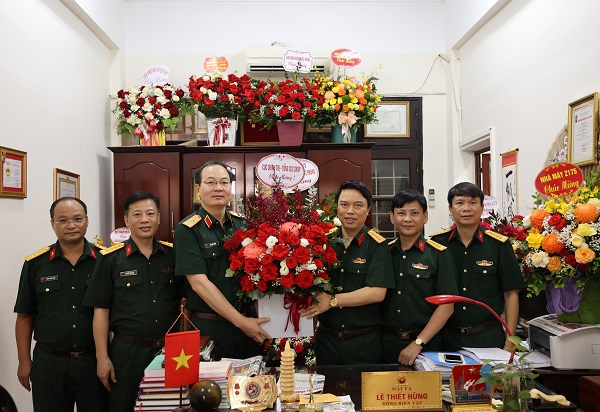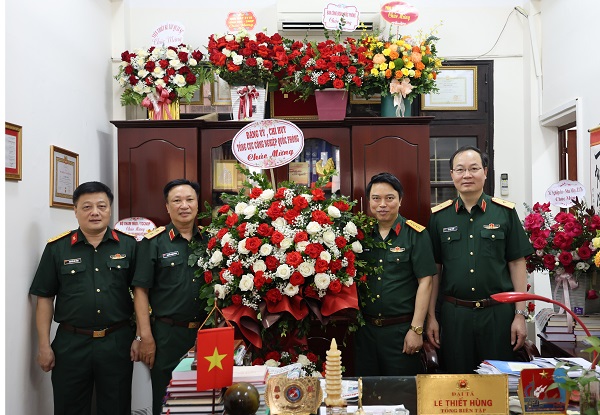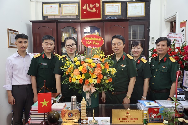 Đoàn cán bộ Cục Hậu cần do Đại tá Phạm Văn Tuấn, Cục trưởng Cục Hậu cần dẫn đầu, tặng hoa chúc mừng Ban biên tập Tạp chí.
