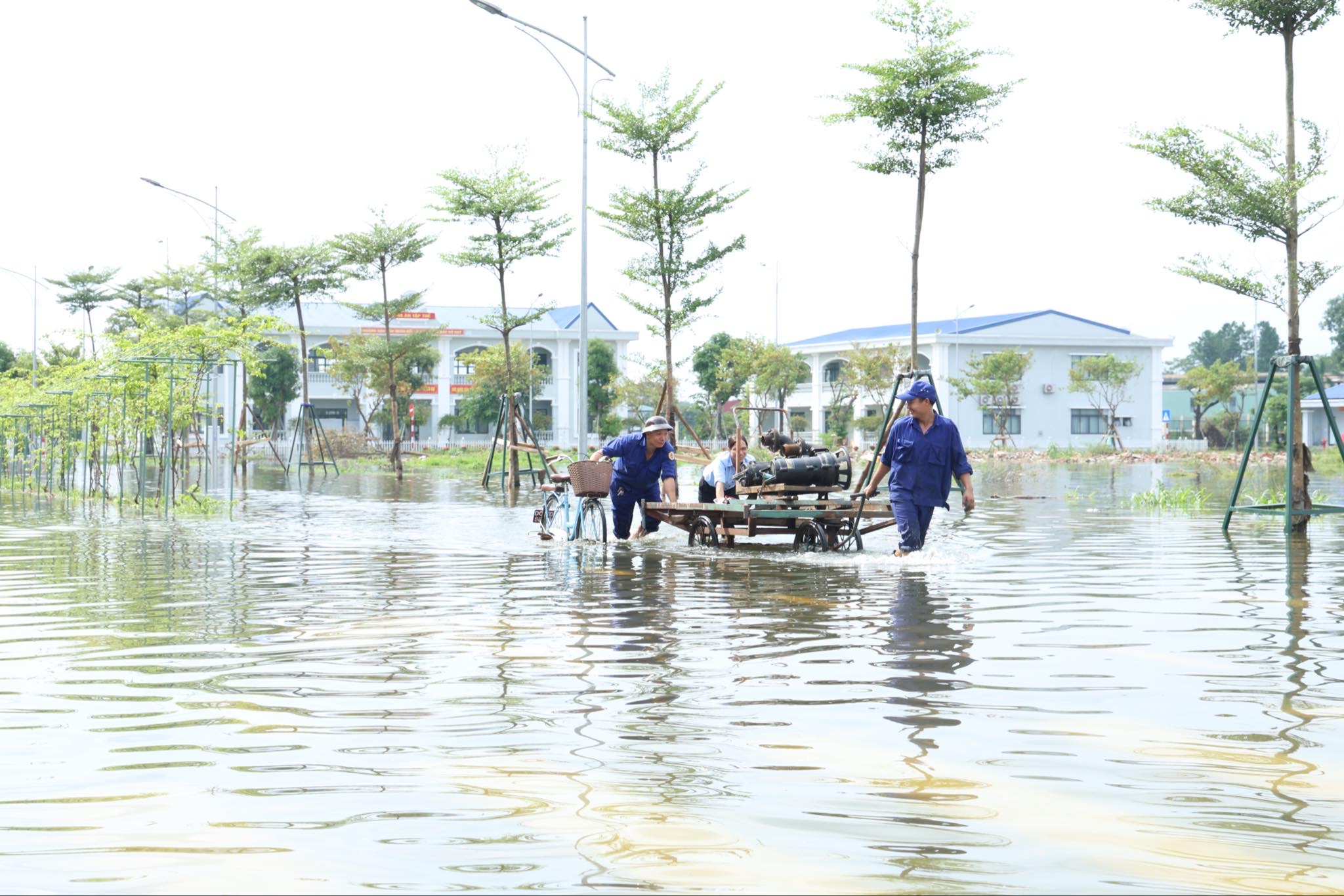 Công nhân Nhà máy vận chuyển máy bơm nước công suất lớn phục vụ công tác hút nước, chống ngập úng.