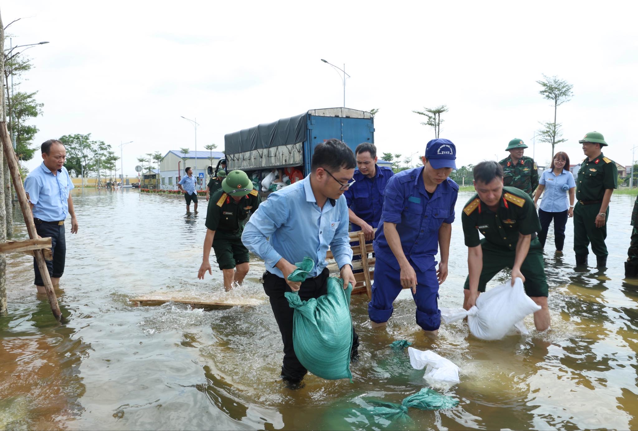 Cán bộ, công nhân viên Nhà máy Z117 tích cực đắp bờ bao ngăn nước tràn vào nhà xưởng.