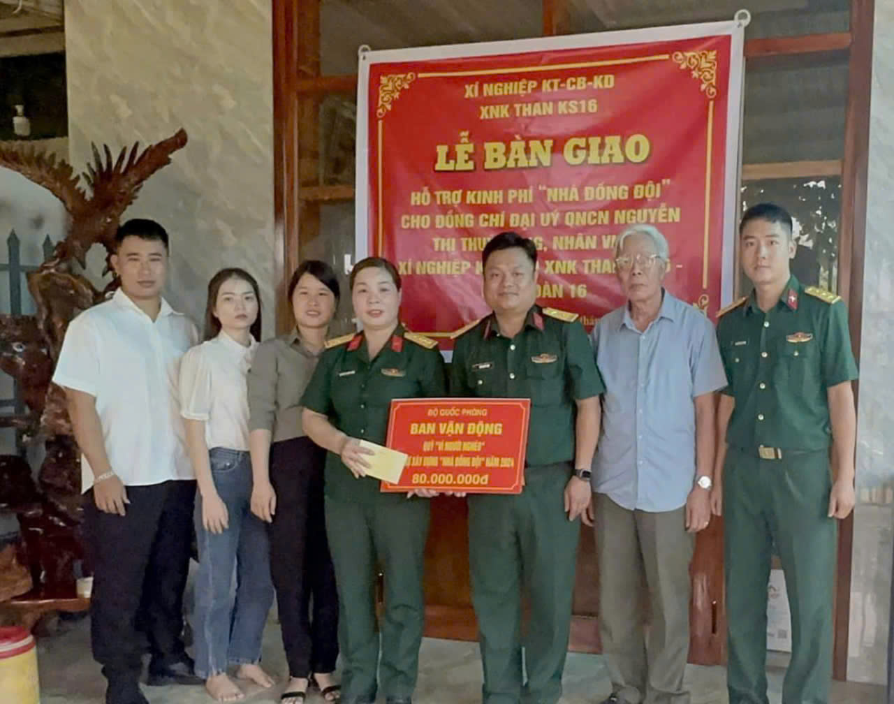 Đại úy QNCN Nguyễn Thị Thúy Hằng là một trong những quân nhân gắn bó với đơn vị từ những ngày đầu thành lập, luôn hoàn thành tốt nhiệm vụ được giao, nhiều năm liền được các cấp khen thưởng. Tuy nhiên, đồng chí có hoàn cảnh gia đình khó khăn, chưa có điều kiện xây dựng nhà để ổn định cuộc sống. Ban giám đốc Xí nghiệp đã đề nghị Binh đoàn 16 hỗ trợ kinh phí giúp gia đình Đại úy QNCN Nguyễn Thị Thúy Hằng xây dựng nhà ở.