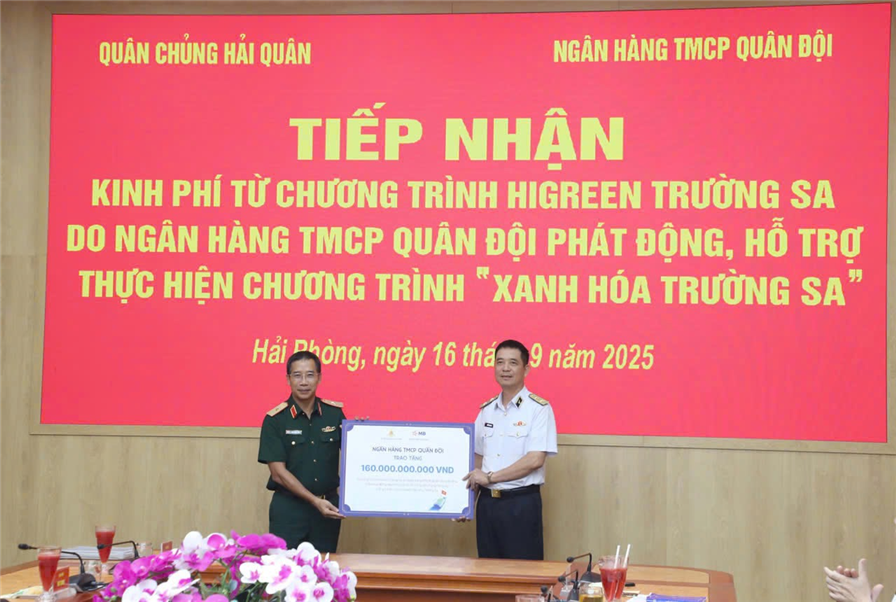 Đại diện MB trao kinh phí từ Chương trình HiGreen Trường Sa hỗ trợ thực hiện chương trình "Xanh hóa Trường Sa" tặng Quân chủng Hải quân.