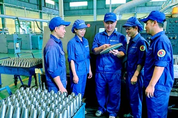 Công nhân trẻ Nhà máy Z115 (thuộc Tổng cục CNQP) trao đổi kinh nghiệm sản xuất sản phẩm quốc phòng.     Ảnh: CTV
