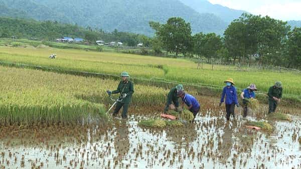 Cán bộ, chiến sĩ Đoàn kinh tế - quốc phòng 92, Quân khu 4 giúp dân thu hoạch lúa. Ảnh: CTV