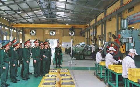 Đoàn công tác của Tổng cục CNQP thăm và làm việc tại Nhà máy Z175 (tháng 12/2019).           Ảnh: PV