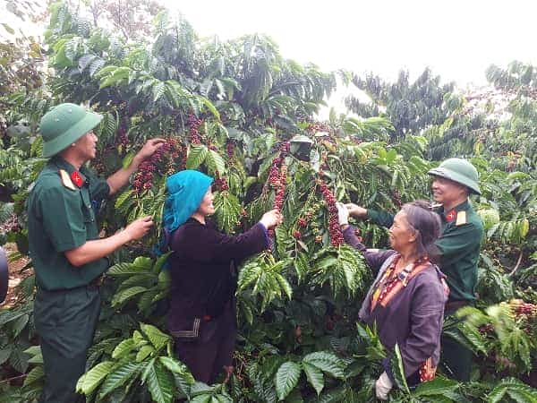 Cán bộ của Binh đoàn hướng dẫn đồng bào dân tộc thu hoạch cà phê.