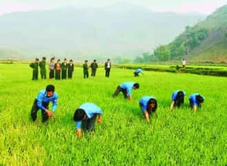 Đội viên trí thức trẻ tình nguyện Đoàn KT-QP 326 hướng dẫn nhân dân trồng lúa.