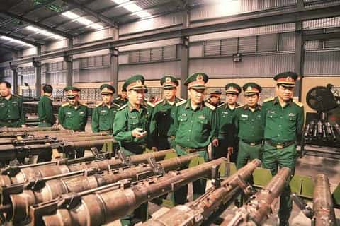 Trung tướng Nguyễn Mạnh Hùng, Bí thư Đảng ủy, Chính ủy Tổng cục CNQP, thăm và làm việc tại Nhà máy (năm 2019). Ảnh: MAI PHƯƠNG