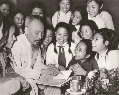 Chủ tịch Hồ Chí Minh và các cháu thiếu niên. Ảnh: TL