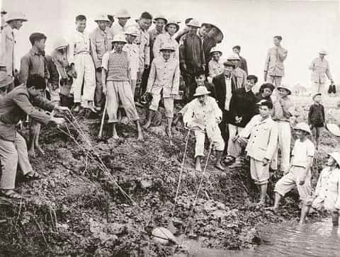 Chủ tịch Hồ Chí Minh tát nước chống hạn với bà con nông dân xã Đại Thanh, huyện Thường Tín, tỉnh Hà Đông (năm 1958).    Ảnh: TL