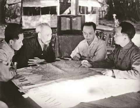 Chủ tịch Hồ Chí Minh và các đồng chí trong Ban Thường vụ Trung ương Đảng họp quyết định mở Chiến cuộc Đông Xuân (1953-1954) và Chiến dịch Điện Biên Phủ (năm 1954). Ảnh: TL