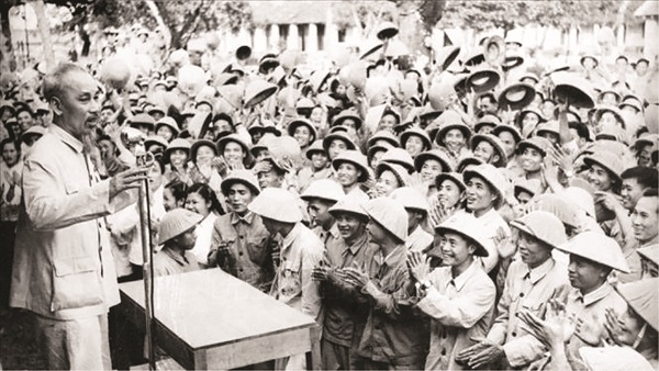 Chủ tịch Hồ Chí Minh đến thăm một đơn vị quân đội ở Nam Định (năm 1957). Ảnh: TTXVN