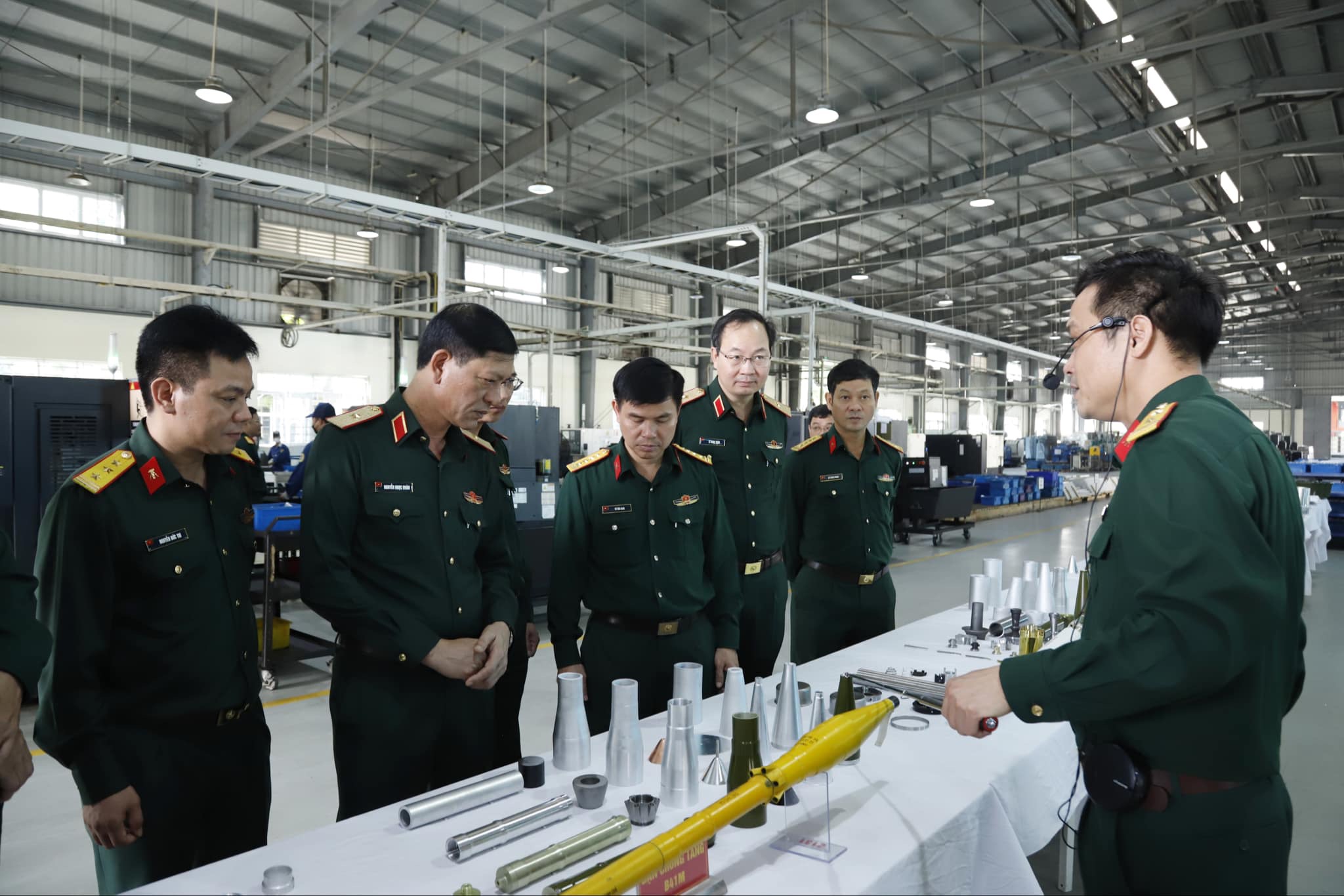 Các thành viên đoàn kiểm tra xem sản phẩm quốc phòng do Nhà máy Z131 sản xuất.