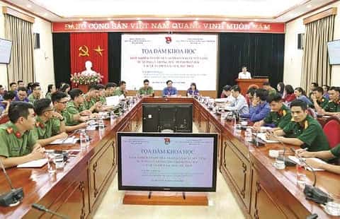 Đoàn viên trong các lực lượng vũ trang tham gia tọa đàm khoa học “Kinh nghiệm thanh niên tham gia bảo vệ nền tảng tư tưởng của Đảng, đấu tranh phản bác các quan điểm sai trái, thù địch".   Ảnh: CTV