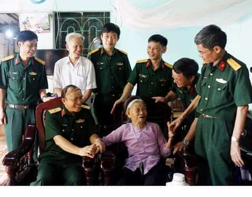 Thiếu tướng Lâm Trọng Đông, Chủ nhiệm Chính trị Tổng cục CNQP, cùng đoàn cán bộ cơ quan Tổng cục thăm Mẹ Việt Nam Anh hùng Kiều Thị Xe ở xã Đại Đồng, huyện Thạch Thất, Hà Nội.    Ảnh: Minh Tuấn