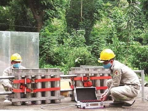 Cán bộ kỹ thuật Nhà máy Z121 thực hiện đấu nối các giàn pháo hoa. Ảnh: THÀNH LONG