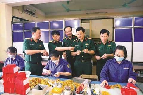 Thủ trưởng Cục Tuyên huấn (Tổng cục Chính trị) và Thủ trưởng Tổng cục Công nghiệp quốc phòng kiểm tra sản xuất tại Nhà máy Z117 (tháng 9/2022). Ảnh: HÀ ANH