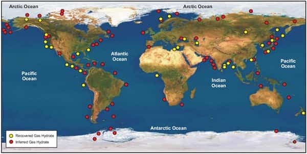Bản đồ phân bố các tích tụ băng cháy do Canada công bố dựa trên dữ liệu từ Kvenvolden và Rogers.