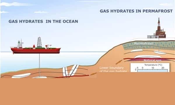 Minh họa về việc khai thác băng cháy ở trên bờ và ngoài khơi.