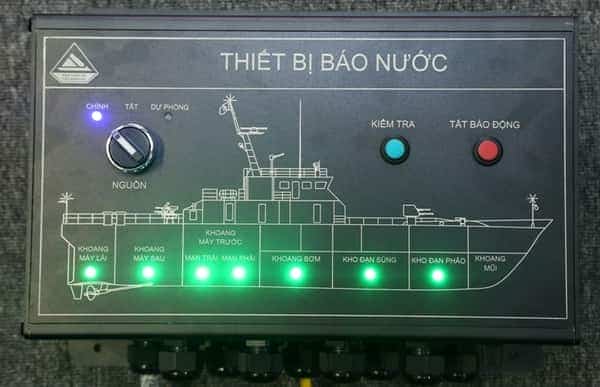Bộ thiết bị báo nước trên tàu thủy có chức năng tự động kiểm tra, giám sát, cảnh báo bằng tín hiệu đèn và chuông báo động khi có nước ngập trong các khoang tàu. Nguyên lý hoạt động là hộp điều khiển trung tâm nhận tín hiệu báo có nước ngập trong khoang tàu từ cảm biến, phát ra tín hiệu bằng đèn và sau 15 giây phát tín hiệu chuông cảnh báo có nước ngập trong các khoang tương ứng.