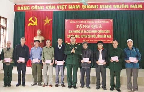 Đại tá Nguyễn Việt Hùng, Phó Chính ủy Tổng cục CNQP, tặng quà các gia đình chính sách xã Yên Đĩnh, huyện Chợ Mới, tỉnh Bắc Kạn.  Ảnh: PV